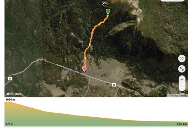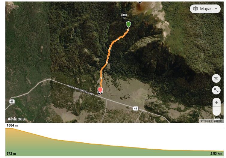 Los primeros metros la huella atraviesa un pastizal bajo, de frente a la montaña, y toma paulatinamente hacia la izquierda hasta ingresar al bosque, dónde aparece un cartel indicador. A partir de aquí el ascenso es continuo, la senda es clara y atraviesa un interesante bosque de lengas, alternando con algunos claros ideales para descansar y apreciar la hermosa vista del valle del lago Lacar.