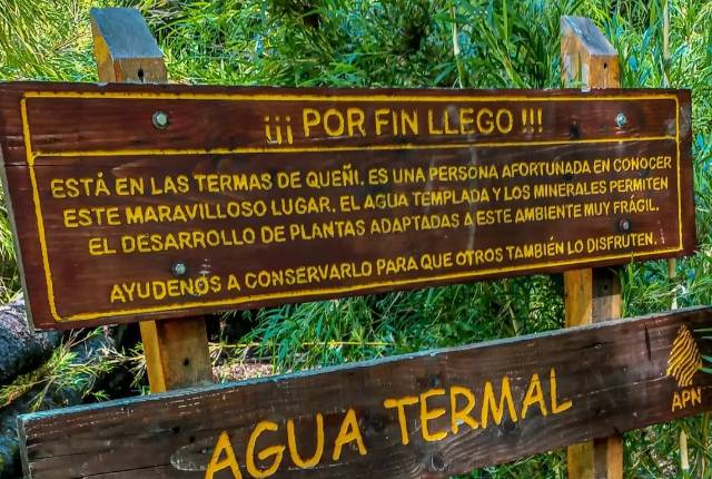 Llegaremos al Lago Queñi alrededor del medio dia, almorzamos y luego hacemos una caminata de 1 hs aproximadamente hasta las termas, alli estaremos un rato para disfrutar del lugar y regresaremos.